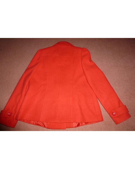 Red Woman's Jacket Coat. Label size 14. Has 2 front vertical pockets with a flap and decorative button over the top of each. Fastens via one hidden inside button and 3 outside buttons (has 3 other buttons on the front for decoration).