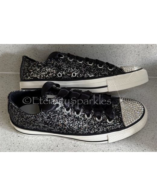 Customised Black Glitter & Crystal Sparkle Converse All Star With Satin Ribbon Laces. Genuine Converse All Star Lo Trainers In A Striking Black Glitter Design. Black Satin Ribbon Laces Included (Original Converse Laces Will Be In Box).