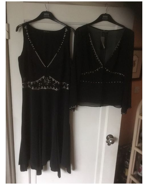 black silk evening jacket. Embellished with pewter coloured Matt sequins on front & all around end of sleeves. Jacket blouse can be worn open or fastened by 4 concealed hoof & eyes.Back of jacket has 4 fine seams to waist area. Note I have listed & priced separately a matching dress but a size 16 as shown in photos 2,3 & 4. Also new but no ticket . If interested.