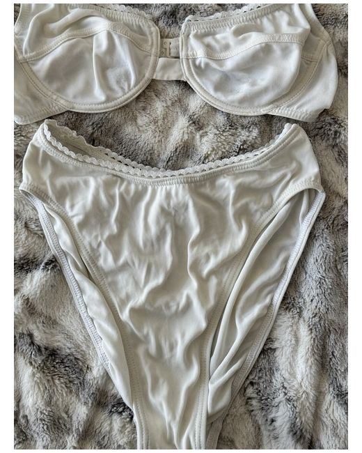 This stunning white bikini set in size M is perfect for your next beach holiday. The set includes a triangle-shaped swim top and high-waisted swim bottoms, both adorned with the iconic M & M brand. The bikini is made for women and is a regular size type. The bikini set is ideal for a day at the beach or poolside. The white colour adds a touch of elegance and sophistication to your swimwear collection. So, whether you're lounging in the sun or taking a dip in the water, this bikini set is a must-have.