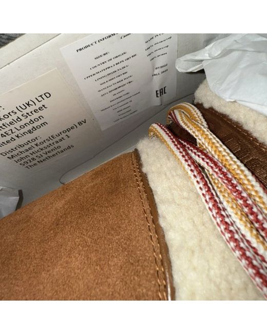 Michael Kors Zelda shearling snow boots brown/cream white calf leather shearling round toe front lace-up fastening contrasting laces chunky rubber sole slip-on styleMichael Kors snow boots, Winter boots, Waterproof boots, Designer boots, Fashion boots, Warm footwear, Stylish snow boots, Cozy boots, Casual wear, High-quality, Cold weather, Insulated boots, Trendy, Comfortable, Lace-up boots, Faux fur, Slip-on boots, Outdoor footwear, Fashion statement, Brand name, Everyday wear, Gift idea, Classic design, Luxury footwearOnly ever worn to try on, been sitting in my wardrobe in their box. Brand new in original box, I have the paper and email receipt.Farfetch has these online for £424 CompositionLining: Polyester 100%Outer: Nappa Leather 100%, Suede 100%, Artificial Fur 100%Sole: rubber 100%