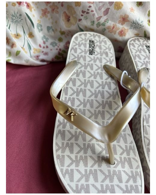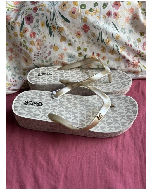 This product is a pair of Michael Kors platform sandals in size 4.5 UK (5 US, 37 EU). They are designed for women and feature a slider style with a lightweight rubber upper material in beige colour. The sandals are perfect for summer season wear, offering both style and comfort for any casual or dressy occasion.