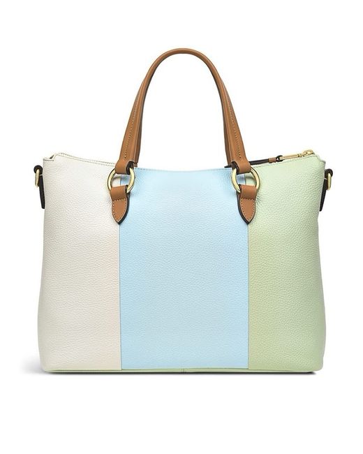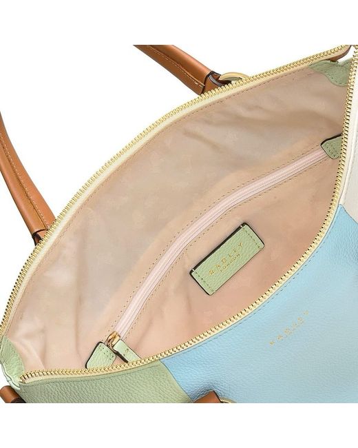RADLEY LEATHER HANDBAG SHOULDER MULTIWAY CROSS BODY BAG. RADLEY London Eel Alley Stripe - Large Ziptop Satchel, Cucumber. Crafted in grained leather, Vertical stripe panelled design. Interior pockets, Foil print logo, Detachable padded Scottie dog charm.