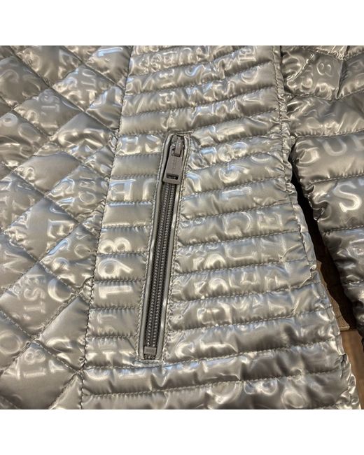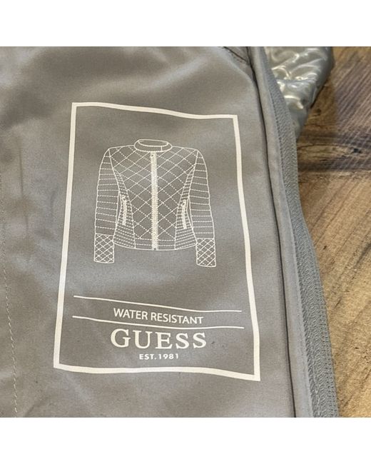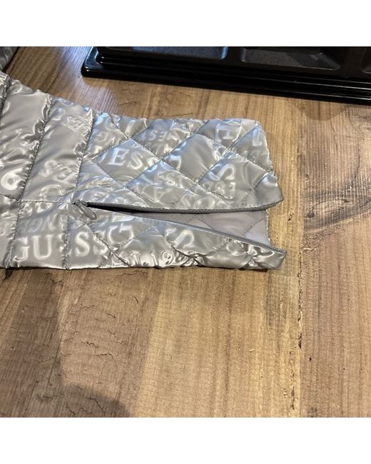 Beautiful women’s Guess quilted jacket. Full zip closure with popper at the neck. Sleeves have zips as well. Both pockets also have zips. Water resistant. The fabric is a lovely silver with the Guess name all over it.