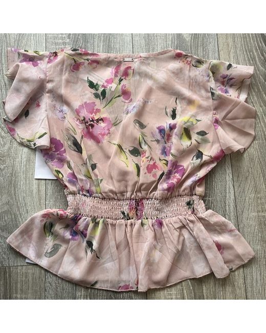 Elevate your wardrobe with this stunning Guess Floral Peplum Top in size S. The multicoloured blouse features a beautiful floral pattern, short sleeves and a stylish peplum design that will flatter your figure. Perfect for any occasion, this regular fit top is made from high-quality materials and is designed to last. Pair it with your favourite jeans or skirt for a chic and trendy look that will make you stand out from the crowd. Whether you're dressing up for a night out or dressing down for a casual day, this top is a versatile addition to your collection. Don't miss out on the chance to own this must-have piece from Guess.