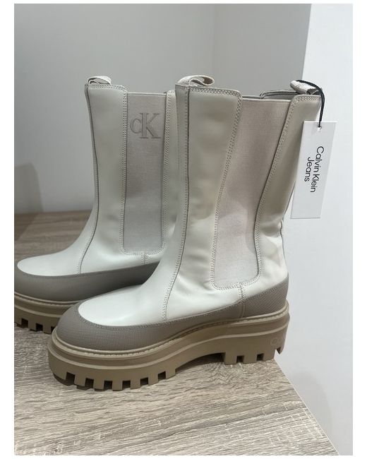 The product is a pair of Calvin Klein women's boots in a cream colour, made from faux leather and leather materials. These casual boots are not handmade, nor are they vintage. They are a stylish accessory perfect for everyday wear, showcasing the iconic Calvin Klein brand. The design is sleek and versatile, making them a must-have addition to any woman's wardrobe.