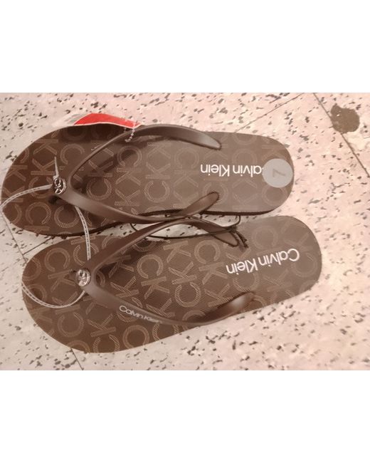 Step into comfort and style with these Calvin Klein sandals. Perfect for a day at the beach or a casual stroll, these brown synthetic flip-flops feature a flat heel for all-day wearability. The brand's signature logo adds a touch of sophistication to these versatile sandals, making them a must-have for any fashion-forward woman. Available in UK size 5, US size 7, and EU size 41, these sandals are sure to fit the bill. Add them to your shoe collection today! I do have other sizes. Contact me for more information