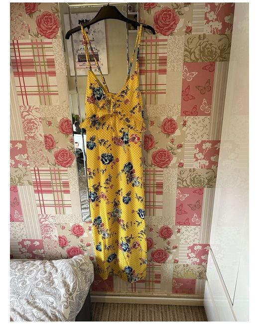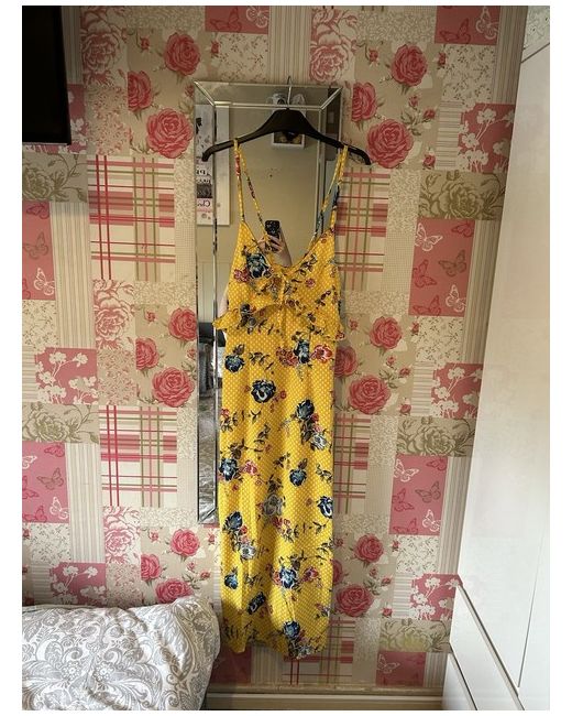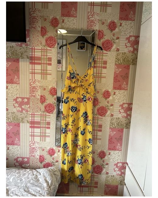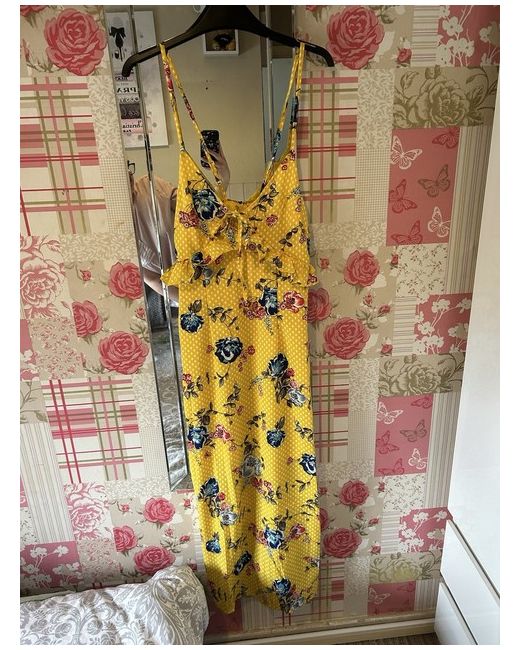 maxi summer dress features a floral pattern in yellow sleeveless design with a V-neckline with slits in the side Perfect for summer & holidays Brand new with tags Size 8/10