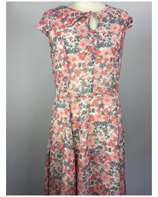 Lightweight with a floaty skirt. Floaty cape style to the shoulders. Joe Browns UK size 14. This can be fixed with a stitch. Pink/ multi all over pretty floral print. Cream lining. Machine washable. Concealed side zip fastening.