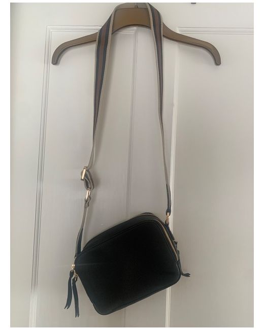 New black leather John Lewis camera bag. With two zipped compartments, one containing a credit card sized pocket. A beige, brown and black striped cross body adjustable strap. A lovely compact bag.