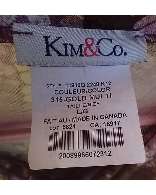 For sale , KIM & CO women's sleeveless draped top .Label says gold multi, colours of pink lilac , browns with tints of black and white . Very pretty . 92 % polyester , 8% elastane . New without tags.
