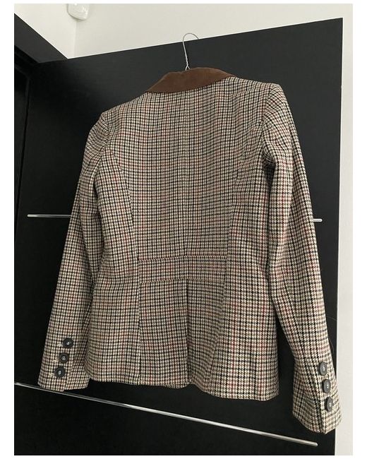 Very attractive small checked jacket in browns and maroon and cream colours with brown corduroy collar as a feature Front decorative pockets and pleated at the back Buttons on the sleeves and fully lined in back Extra buttons still attached Brand is TU Postage additional