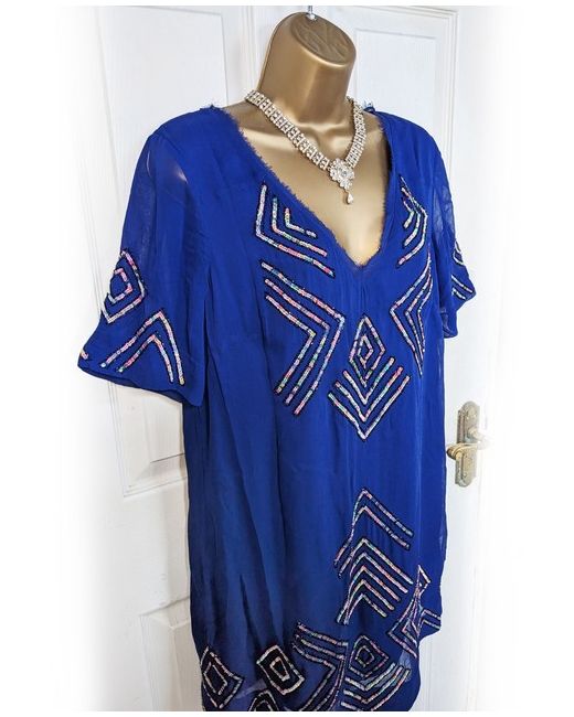The tie at the back is adjustable and should have a relaxed and not a clingy fit. The fabric isn't stretchy.