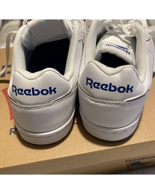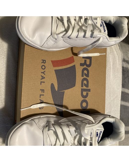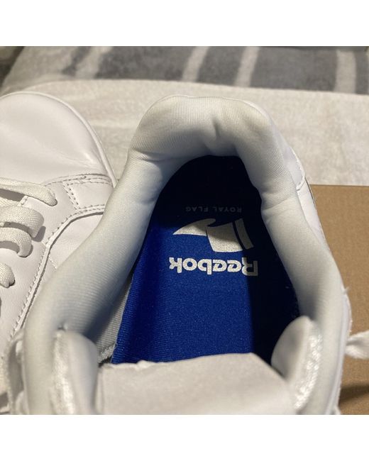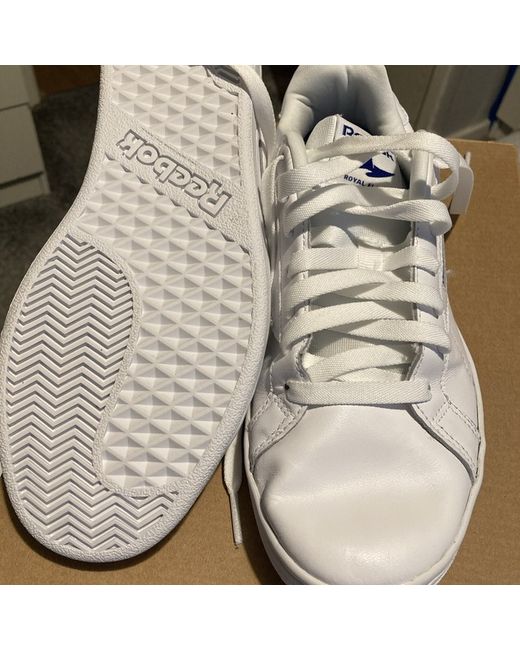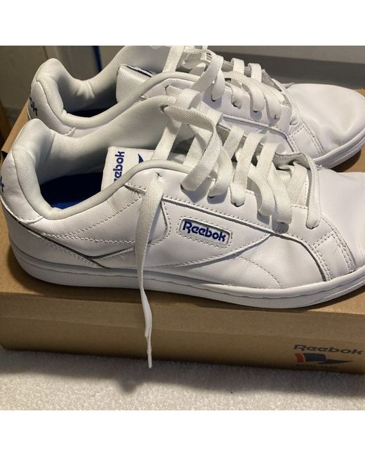 White leather Reebok trainers never worn but has a few creases has been in wardrobe that long white with blue sign thanks for looking happy biding take a look at my other items please