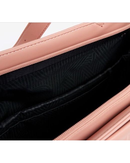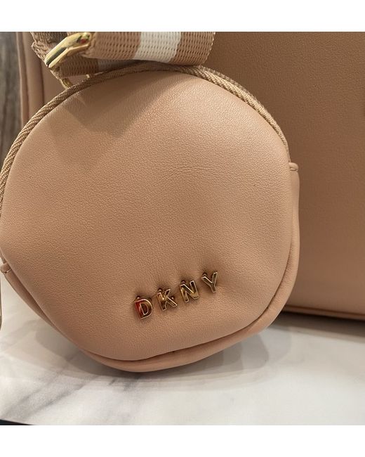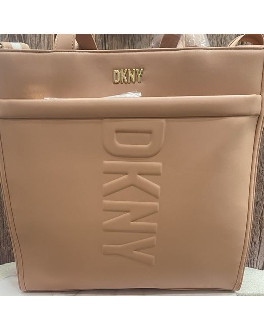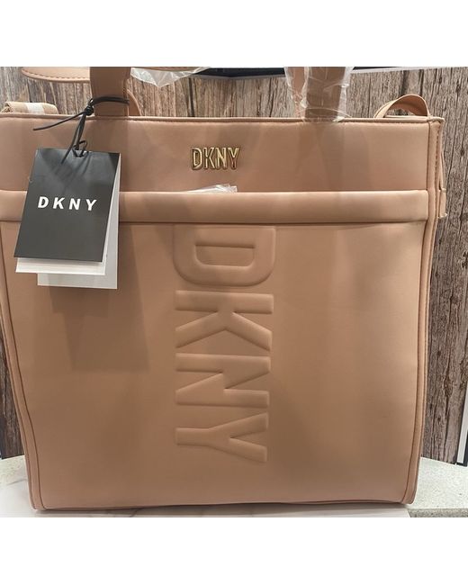 DKNY Tote Pink /Peach Medium Logo on front Mini wallet attachment 5 interior pockets Laptop padded divider 1 external pocket Detachable shoulder strap Zip fastening 100 % polyurethane Height : 35cm Width : 35cm Depth : 2.5 cm Strap length :40cm to 80cm New with Tags
