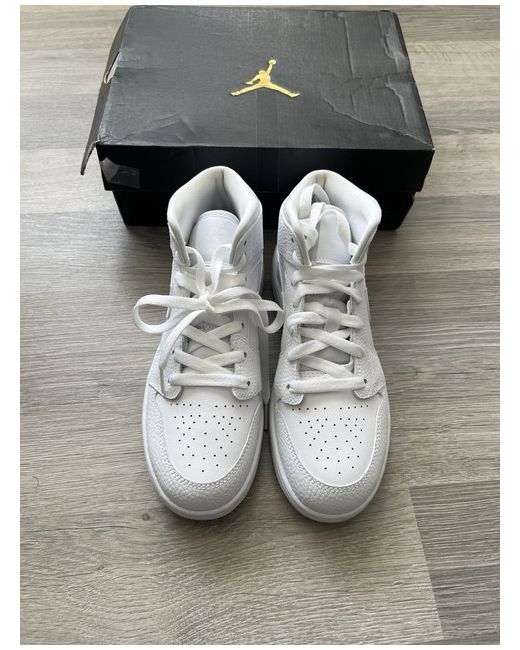 Elevate your sneaker game with these stylish Jordan 1 Mid GS Triple White trainers. The iconic brand speaks for itself, with a sleek and comfortable design perfect for women who want to make a statement. The white colourway adds a touch of freshness to any outfit, while the Midge character detail adds a unique touch. These trainers are perfect for any casual occasion, whether it's a day out with friends or a casual day at work. The trainers are not customised, and the UK shoe size is 4.5. Get your hands on these must-have trainers today!