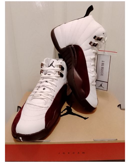 AIR JORDAN 12 RETRO SP. WHITE, BLACK, BURGUNDY CRUSH. They are a UK size 5 and US size 7.5, with an EU size of 38.5. These sneakers feature a sleek black design with the iconic Jordan logo accents.