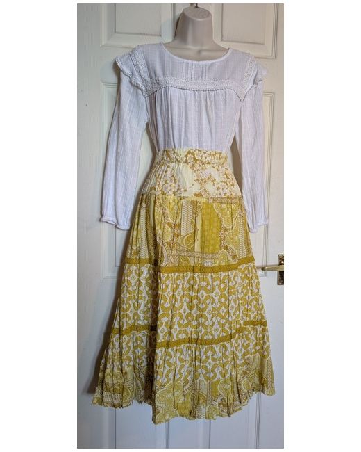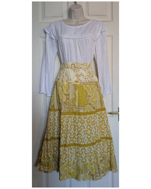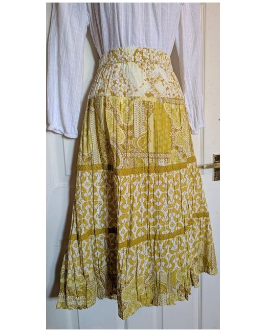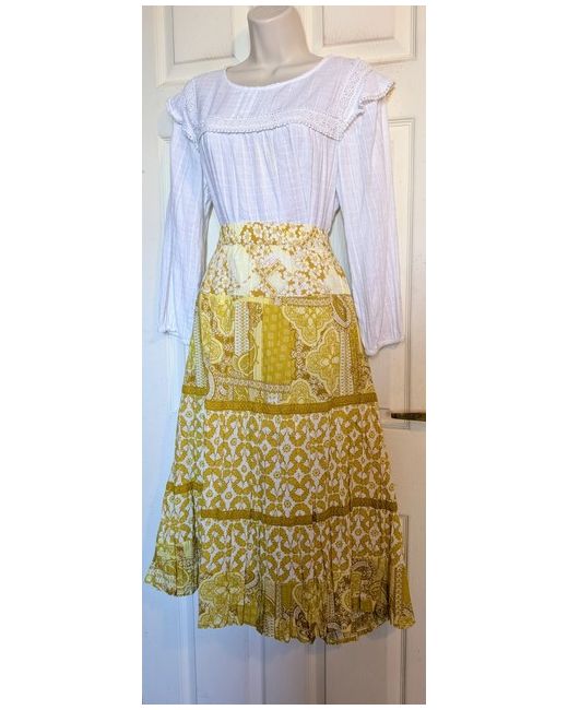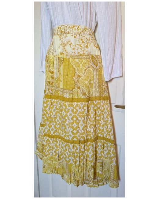 Flared midi length. Crinkle style. 100% Cotton fabric in a lovely gold/yellow and white patchwork paisley print. Marked as a Sz 24. Length 30".