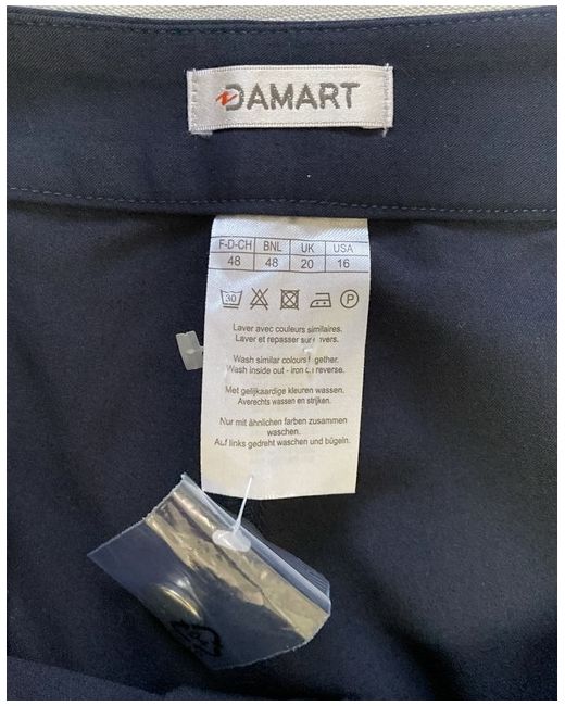Trouser Details. Main colours : Navy. UK Size : 20. Materials : 75% Polyester 20% Viscose 5% Elastane. Number of Pockets : 2.