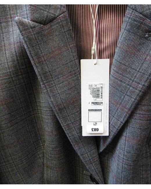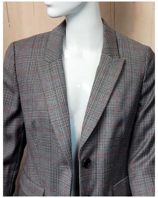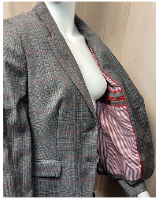 An outstanding blazer jacket by PER UNA. Grey mix check with a dark red accent colour. Well tailored shape, below waist length. 53% new wool, 29% polyester, 16% viscose, 2% elastane. Length 23.5".