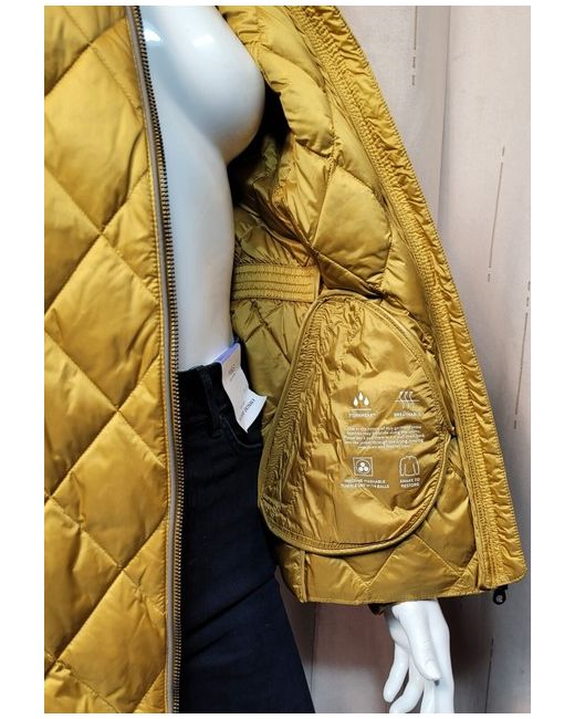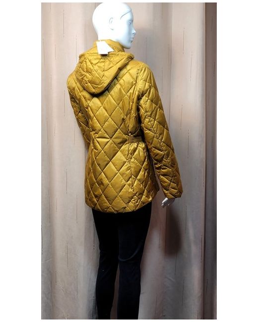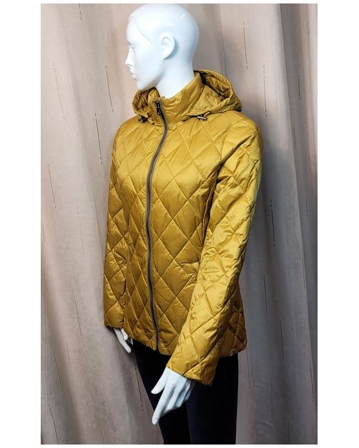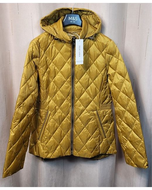 Dark ochre colour, like a gold shade. A terrific quilted jacket by PER UNA. Zip attached, removable hood. Light in weight, with a full down & feather quilting. 100% polyamide (shell & lining), 90% new duck down, 10% duck feather (filler).