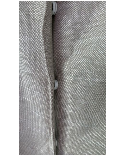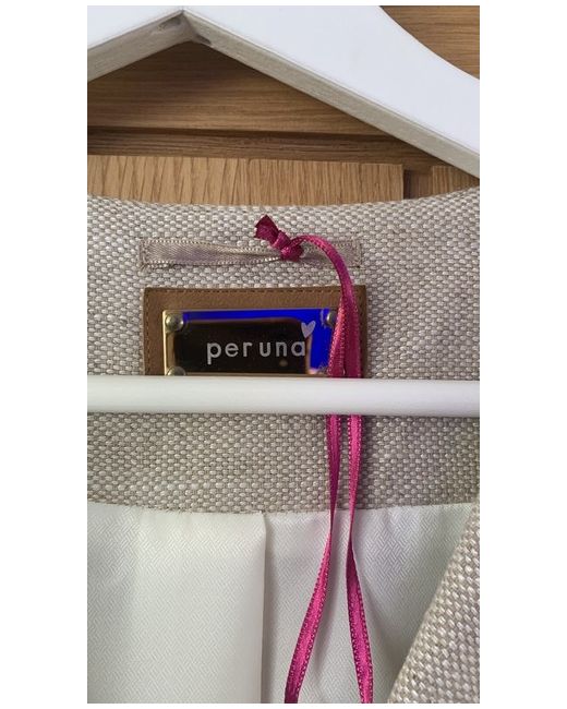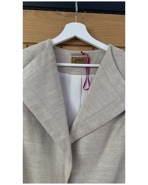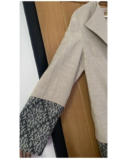 A lovely linen mix coat by Per Una in a minimalist style. It is collarless with wide lapels. The coat is a natural stone/beige collar with contrasting hem and cuffs in a grey mix tribal style print.