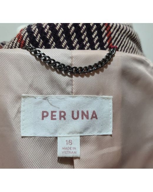 Unworn double breasted size 18 coat featuring patch pockets and tabbed breast pockets, generous rever collar and brown buttons. Back vent is still tacked shut. Beautiful lining with internal buttoned pocket.