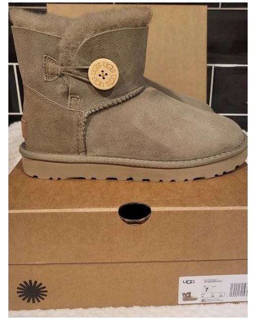 This UGG Mini Bailey Button II boot is in UK size 5 and features a green/grey suede upper with a sheepskin lining. The low heel height and slip-on style make it comfortable and easy to wear. The button detail adds a touch of style to these cosy boots from the UGG Bailey product line, which originally cost £175. All New, No Returns Thank You 😊