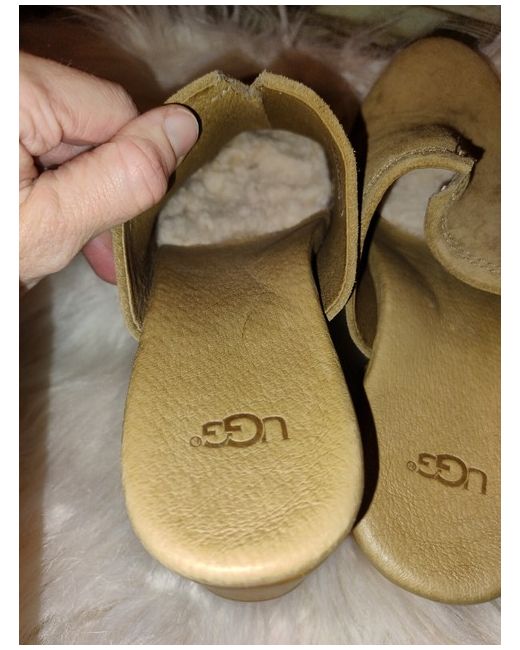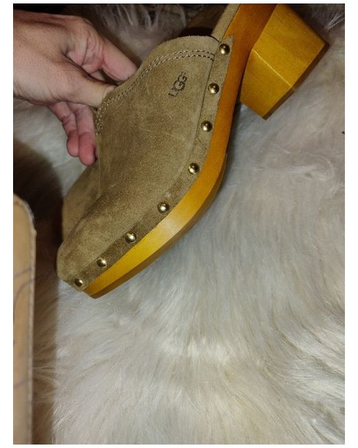 ugg, size 6, clog. mid heel. fur lining in toe half of shoe. not worn outside. tried on inside
