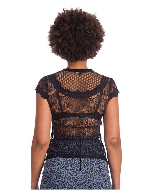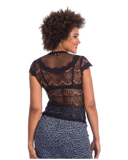 Banned Midnight Top. Black lace top with round neck and frill detail. Cap sleeves. 90% POLYAMIDE 10% ELASTANE KNITED. Cap sleeves. Turret Two Ltd is a UK based supplier of workwear, outerwear, sportswear and fashion apparel.
