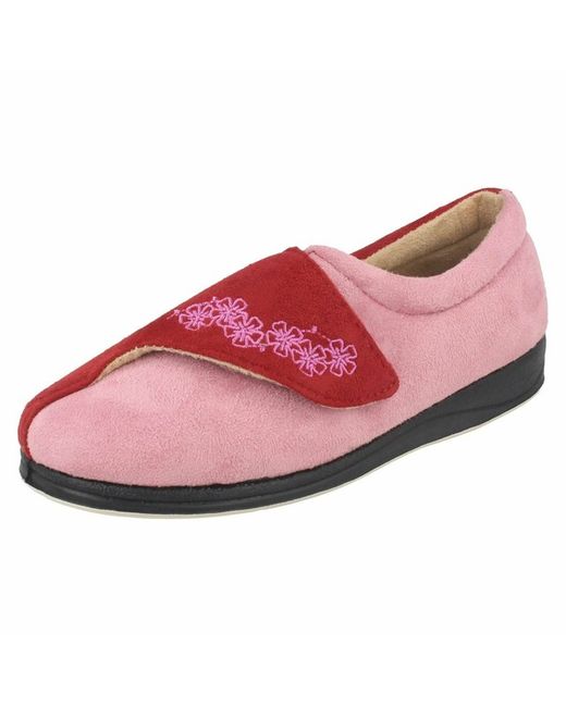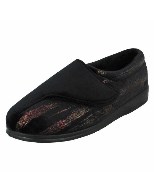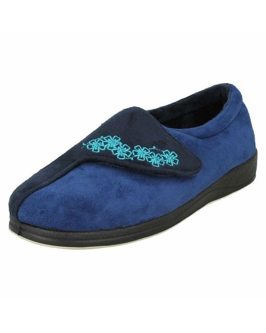 "Hug" by Padders. Comfortable and warm ladies slippers. EE Fitting (extra wide). Hook & loop fastening strap for easy on/off. Lightweight and flexible.