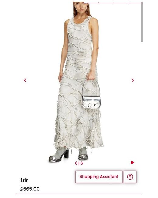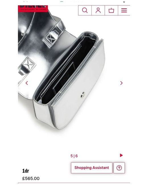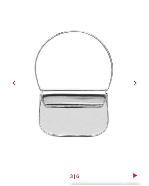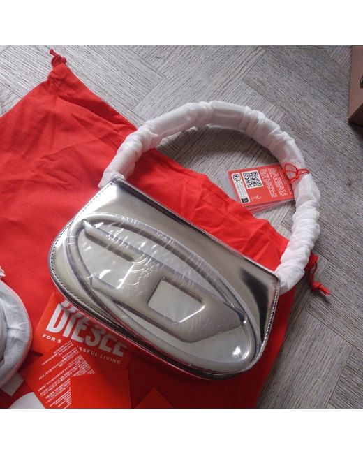 This is a new Diesel 1DR shoulder bag in metallic silver with a round shape. It features a magnetic closure, black lining, and hot stamped initials. The bag has a vintage style with a strap accent, detachable strap, and pouch. It is medium-sized with inner pockets, credit card slots, and waterproof exterior. The bag is lightweight and has an adjustable strap, suitable for various occasions like travel, weddings, parties, and business. Made in Italy with a designer theme.