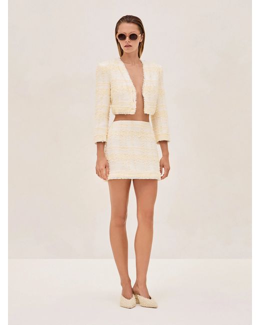 The Estrada Top is both daring and refined, showcasing a cropped tweed design. With delicate straps, pearly buttons, and a frayed edge, it pairs beautifully with the Elma Skirt for a stylish set. For a polished look, layer it with the Benning Jacket.