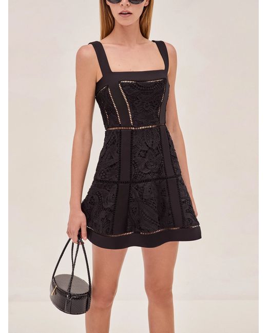 The Mariyah Dress is an embroidered crochet lace mini dress that features a square neckline and inset ladder trim details that add a touch of geometric elegance. The flared skirt offers movement and femininity.