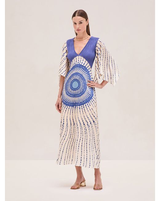 The Matani Dress features a striking sunburst motif and a flowing silhouette. Designed with a plunging V-neckline and flutter sleeves.