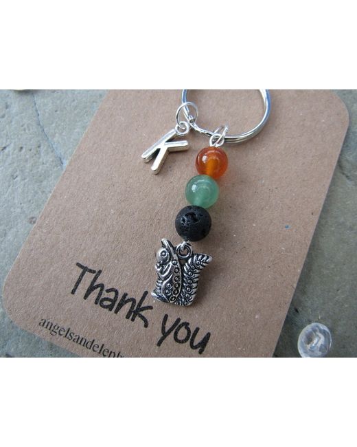Squirrel Diffuser Keyring. The black bead at the bottom is Lavastone, a natural diffuser of scent. Gemstone Beads. Known as the stone of luck. Presented on a backing card with a choice of text.
