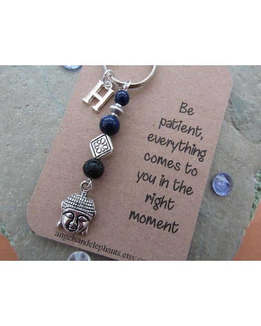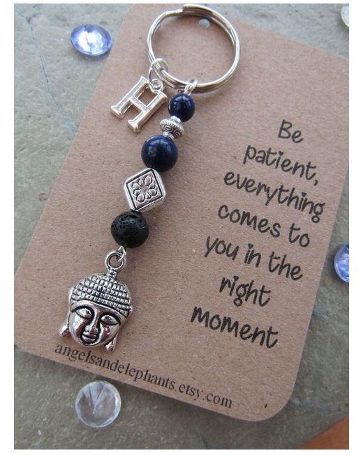 Buddha Diffuser Keyring. The black bead at the bottom is Lavastone, a natural diffuser of scent. Gemstone beads. The charms are made from tibetan silver (lead & nickel free).