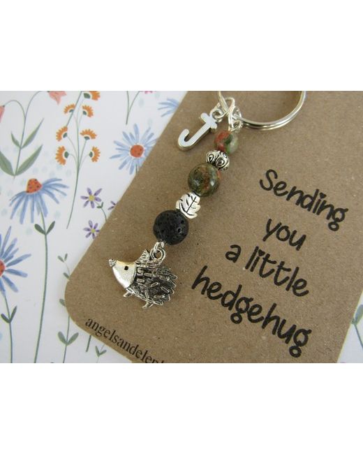 Hedgehog Diffuser Keyring. The black bead at the bottom is Lavastone, a natural diffuser of scent. Gemstone beads. Unakite - A balancing stone. The charms are made from tibetan silver (lead & nickel free).