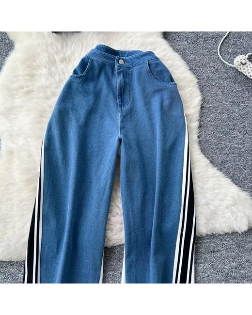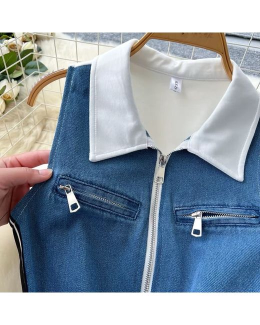 Patchwork Vintage Sets Lapel Neck Zipper Slim Wide Legs Pants Denim