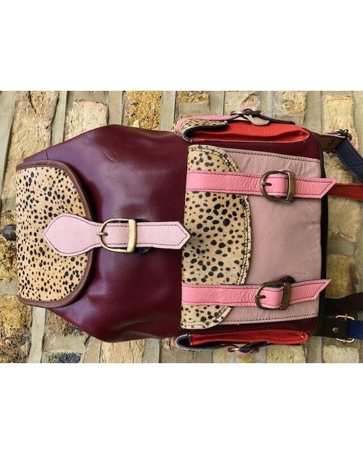 It has been crafted from multicoloured leather patches and real animal hair with leopard print. It's real leather and real animal hair (goat fur). Lovely hippie, bohemian look. In addition, it has a hidden zippered pocket to the back.