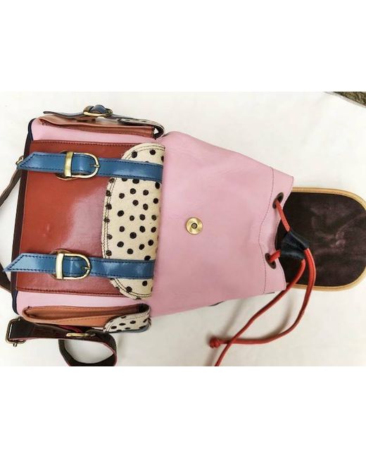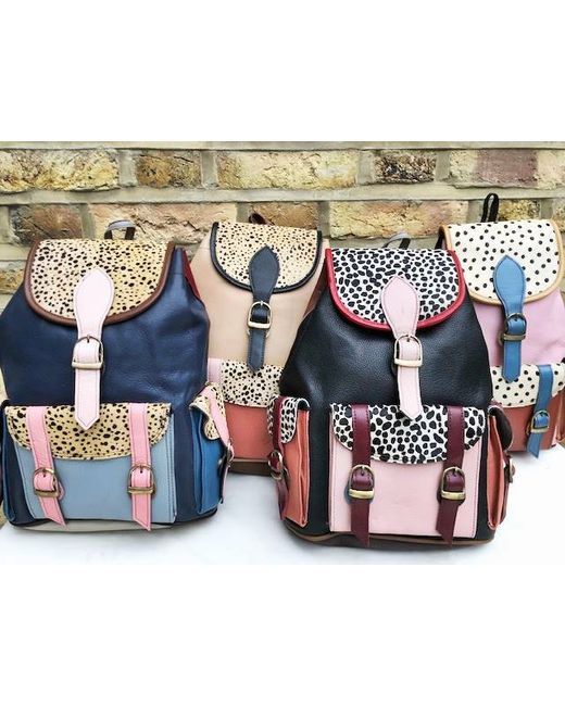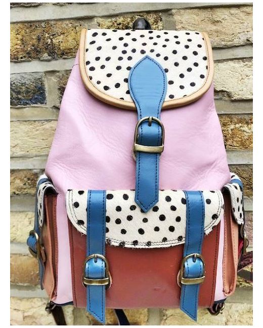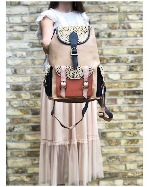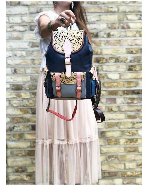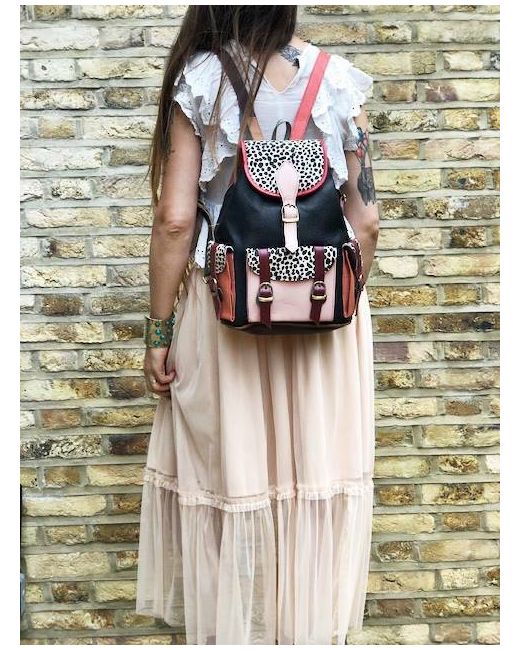 It has been crafted from multicoloured leather patches and real animal hair with leopard print. It's real leather and real animal hair (goat fur). Lovely hippie, bohemian look. In addition, it has a hidden zippered pocket to the back.