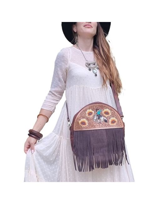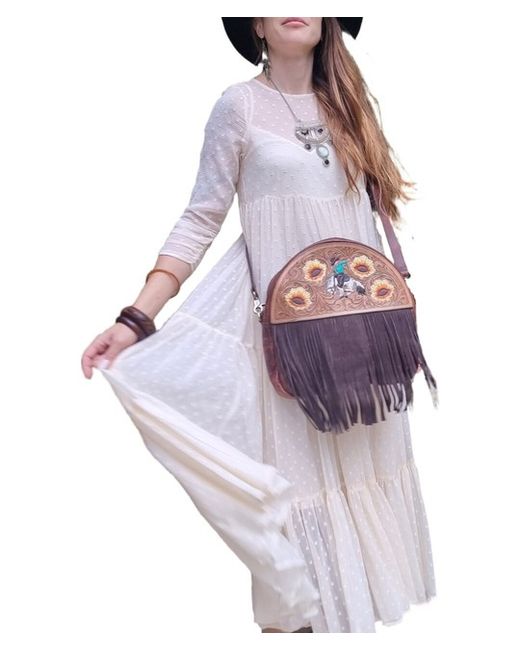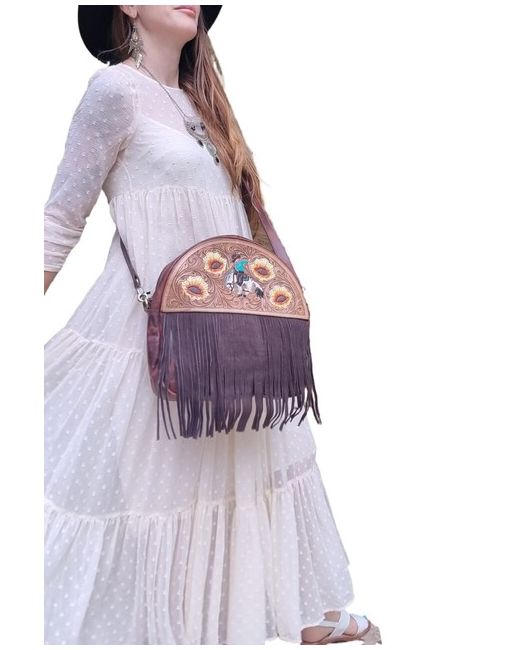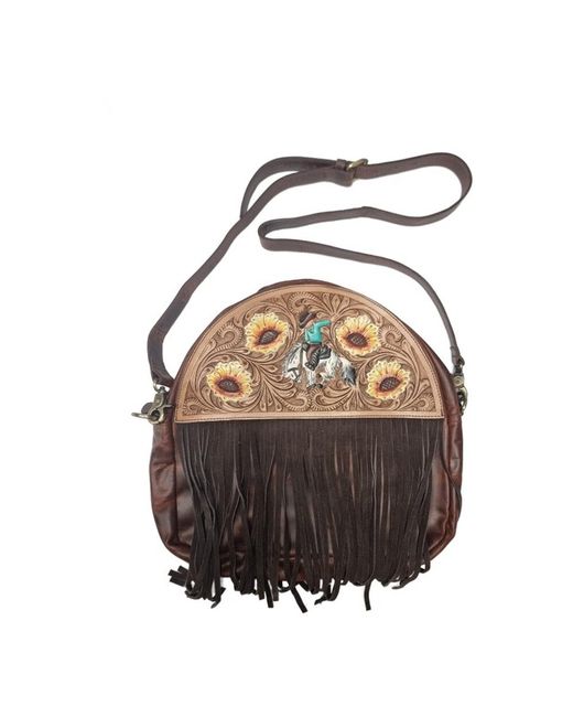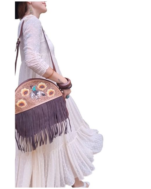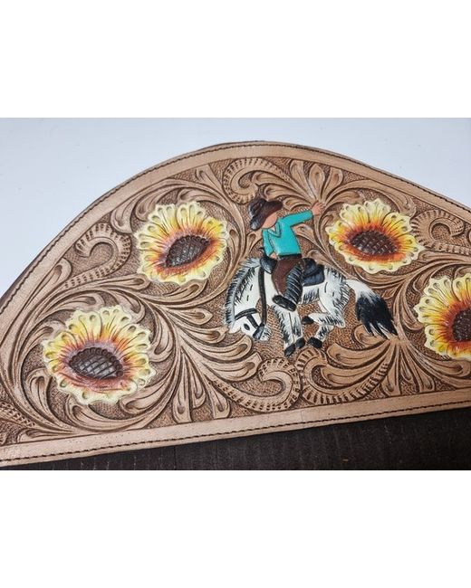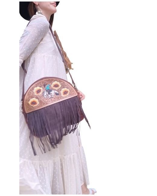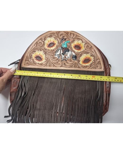 Handmade Western style fringe leather purse with adjustable and detachable crossbody strap. The leather has been hand tooled and hand painted with a sunflower design and a cowboy riding a rodeo horse.