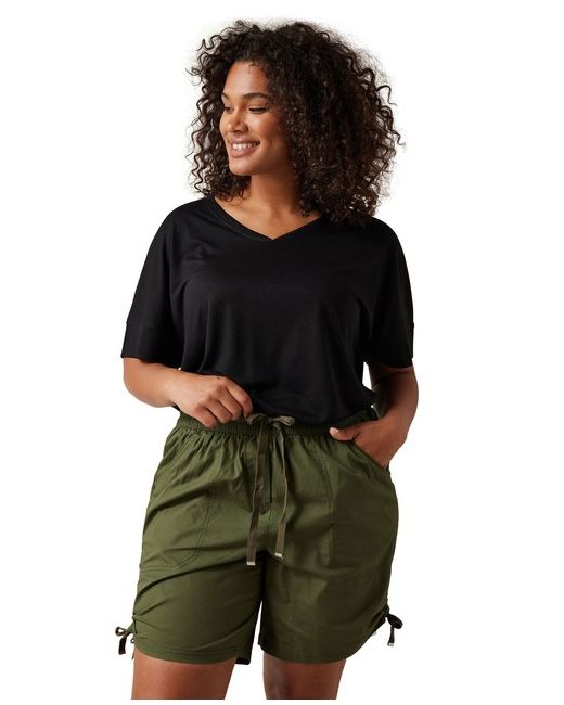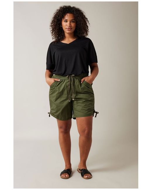Introducing the Evans Khaki Green Ruched Poplin Shorts, where comfort meets sophistication. These shorts feature a stylish ruched design and are crafted from high-quality poplin fabric, ensuring durability and a flattering fit. Perfect for a day out with friends or a casual evening gathering, pair these shorts with a tucked-in blouse and some espadrille wedges for an effortlessly chic ensemble that exudes modern elegance.