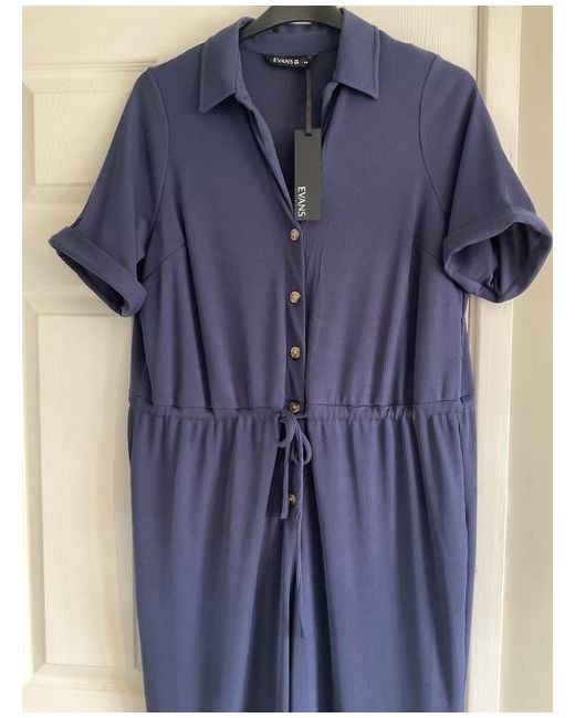 Crafted for comfort and style, the Evans Navy Jumpsuit in size 18 is a versatile addition to your wardrobe. The chic V-neck design coupled with short sleeves makes it an ideal choice for both spring and summer. Featuring a wide-leg silhouette, this one-piece garment offers a flattering look for the plus-sized woman. The jumpsuit is made from a blend of elastane, polyester, and leather, ensuring both stretch and durability. With an inside leg measurement of 73 cm, the adjustable elastic waist and tie closure provide a tailored fit. The ribbed texture adds a touch of elegance, making it suitable for casual occasions.
