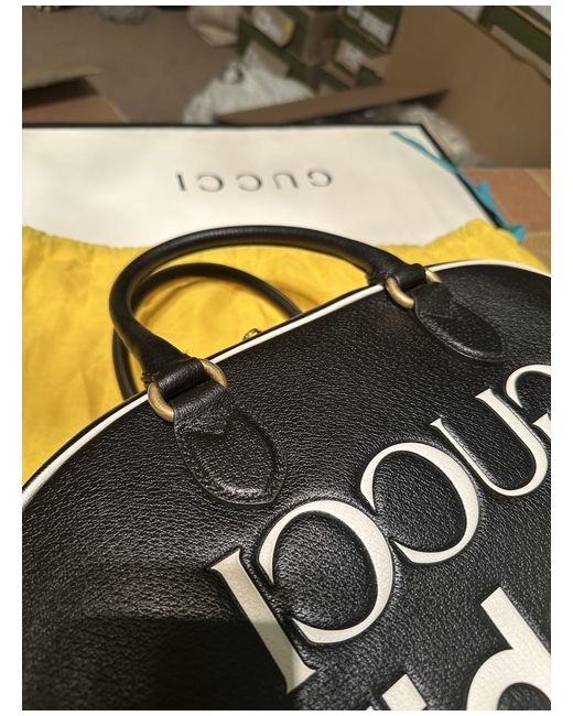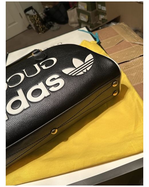 This is a black small duffle bag for men by Gucci in collaboration with adidas. Made of leather, it features a long strap for convenience.