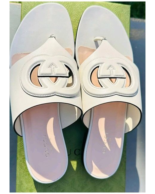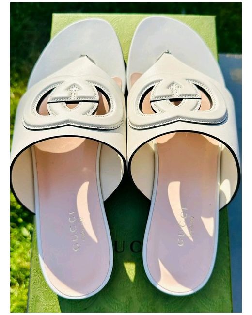 BRAND NEW GUCCI SUMMER SANDALS • INTERLOCKING G CUTOUT DESIGN • TOE POST DESIGN • MYSTIC WHITE IN COLOUR • SIZE 5 UK • EU 38 • MADE IN ITALY • INCLUDES DUST BAG • RETURNS ACCEPTED ON NEW ITEMS ONLY. The Gucci Cutout Interlocking G Leather Toe Post Sandals in Mystic White are a stylish and luxurious addition to any woman's wardrobe. Made in Italy with high-quality leather, these flat sandals feature the iconic Gucci logo as an accent. The open toe design and leather lining make them perfect for casual summer occasions, while the leather upper and insole provide comfort and durability. With a UK size 5 and EU size 38, these sandals are sure to make a statement with their elegant white colour and timeless Gucci design.