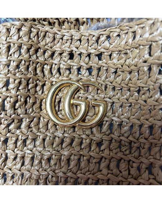 Introducing the stunning Gucci Marmont Raffia Bag, perfect for the fashion-conscious woman who desires both style and functionality. This tote bag is crafted from high-quality raffia material in a beige hue, and features double handles for easy carrying. The bag measures 38cm in width, 30cm in height, and 18cm in depth, making it a spacious accessory for everyday use. The bag is adorned with the iconic Gucci GG Marmont product line, and features gold hardware accents on the handles and straps. The bag is ideal for women who appreciate the luxury of Gucci, and it can be paired with any outfit to create a chic and sophisticated look.