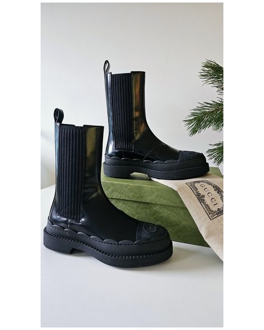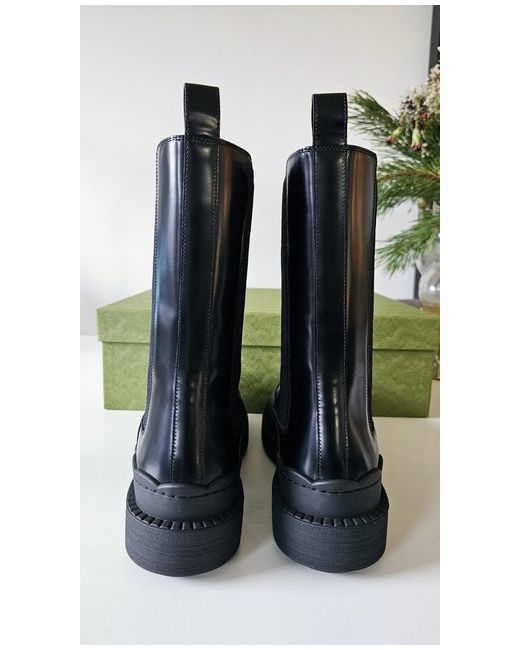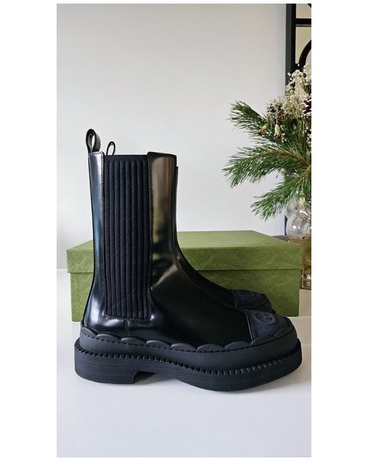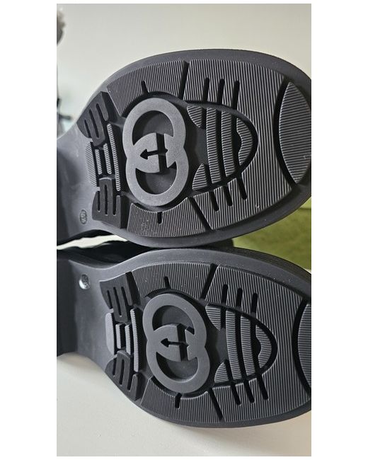 Style ‎758047 AACMT 1000 The Interlocking G is presented in a contemporary way and decorates the front of this leather boots. A scalloped rubber trim further defines the style. Black leather Stretch canvas rib trim Rubber sole Interlocking G rubber toe cap Scalloped rubber hem Flat 0.6″, 1.5 cm heel height They are brand new with box, dust bags.