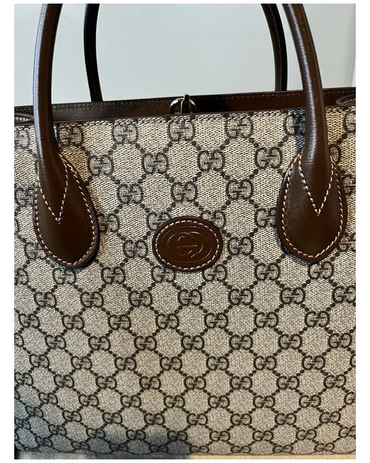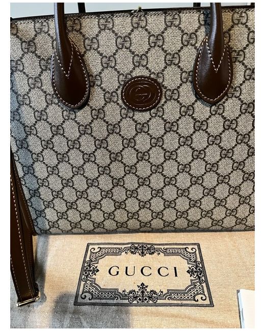 This Italian-made tote from Gucci highlights the label's iconic GG motif and has comfortable leather handles. It is crafted from GG canvas and detailed with rich brown leather trims. Internal details: internal zipped pocket, fabric lining.