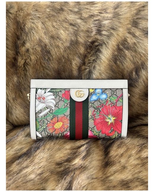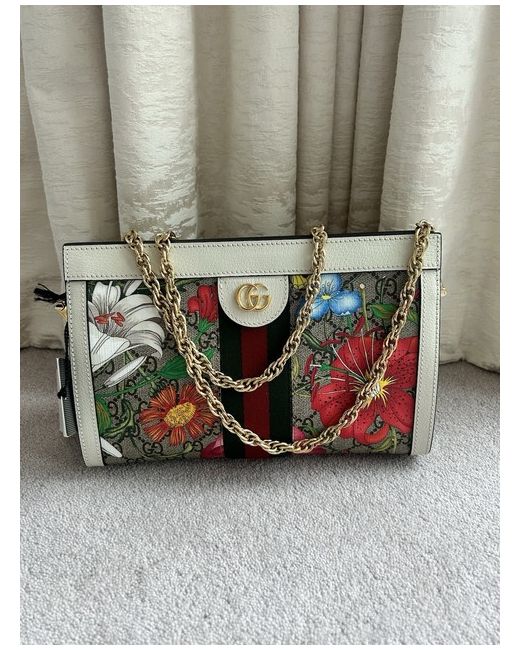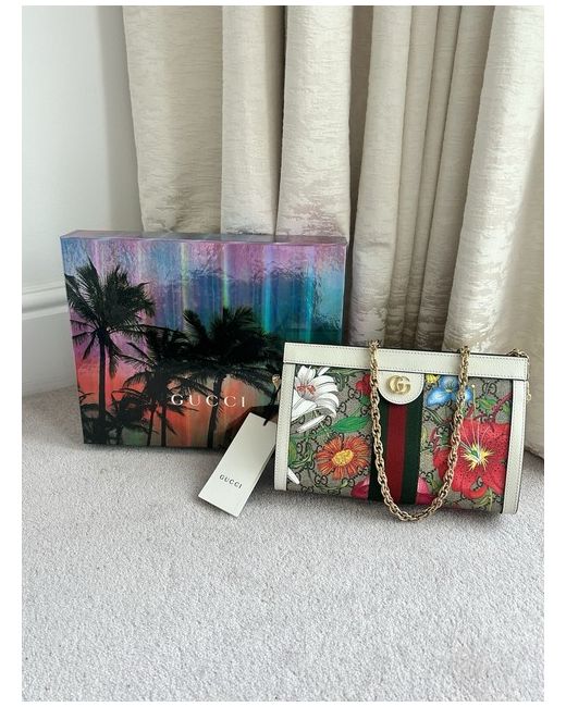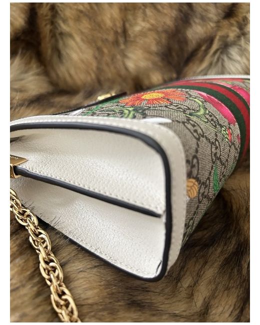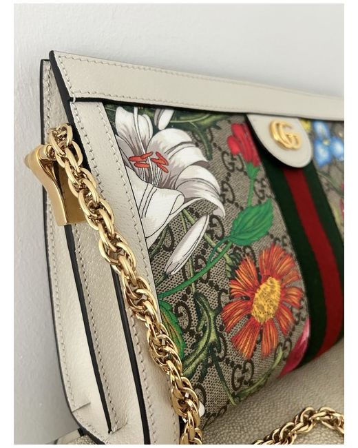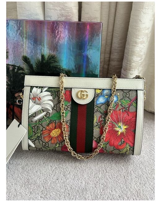 Gucci Ophidia ❤️, This ivory, beige, and ebony compact Gucci Ophidia Flora shoulder bag from Gucci bags is crafted from canvas and leather and adorned with the brand's characteristic green and red Web. It is designed with an all-over GG Supreme emblem and Flora pattern that will give a splash of color to your ever-growing collection. This Gucci shoulder bag comprises of a chain shoulder strap, a top magnetic clasp, a gold-tone GG logo on the front, inside compartments split by a partition, an inner slip pocket, an internal logo patch, and gold-tone hardware. Never been worn